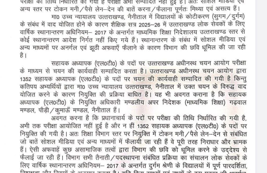 माध्यमिक शिक्षा निदेशक डॉ. मुकुल सती ने स्पष्ट किया कि 1352 सहायक अध्यापक (एलटी) पदों की नियुक्ति प्रक्रिया न्यायालय में विचाराधीन है, इसलिए अभी किसी की नियुक्ति नहीं हुई है।